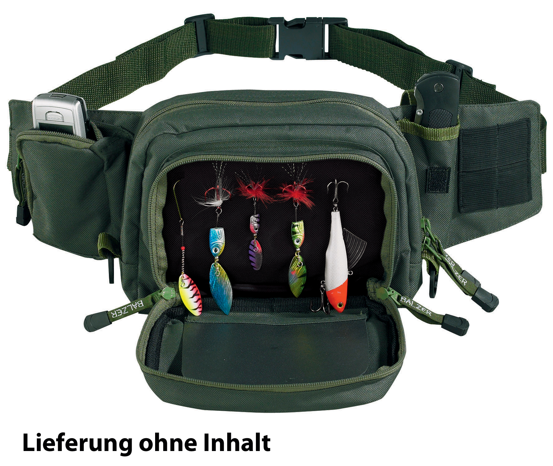 Die Kunstködertasche neigt sich beim öffnen nur zu ca. 30 Grad, so dass die Köder auch bei geöffneter Tasche sicher hängen bleiben und ein äußerst bequemes Handling ermöglichen. Zusätzliche Handytasche sowie Vorrichtungen zum Verstauen von Zange, Messer und Fischtöter.